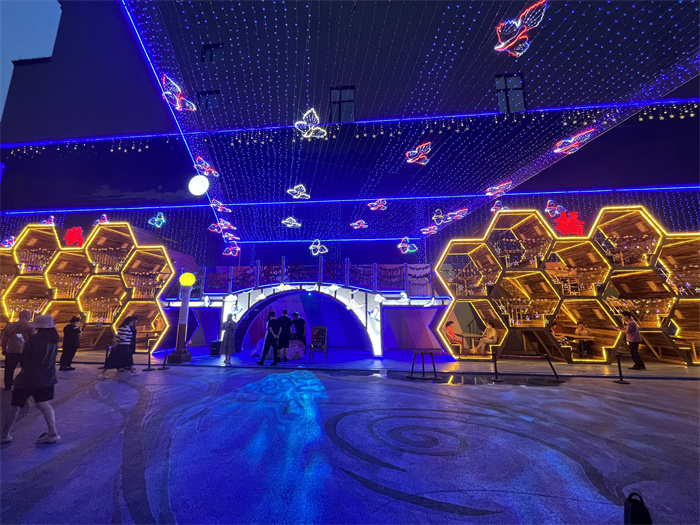 桥身青鸟双飞、祥云环绕,身后3D彩绘星空,星河灿烂,以圆月、喜鹊、繁星等多种造型灯带嵌入其中,桥下3D彩绘河流,波纹影动,流水潺潺,惟妙惟肖。白天,清静优雅,唯美浪漫,晚上星空璀璨,美轮美奂!鹊桥的两侧为广大单身男女提供自助交友区、休闲厅、时光邮局、爱心墙等,同时可为自己的爱情许愿。来百年福街的浪漫圣地,愿每一个人都能在福街鹊桥找到属于自己的爱情。
